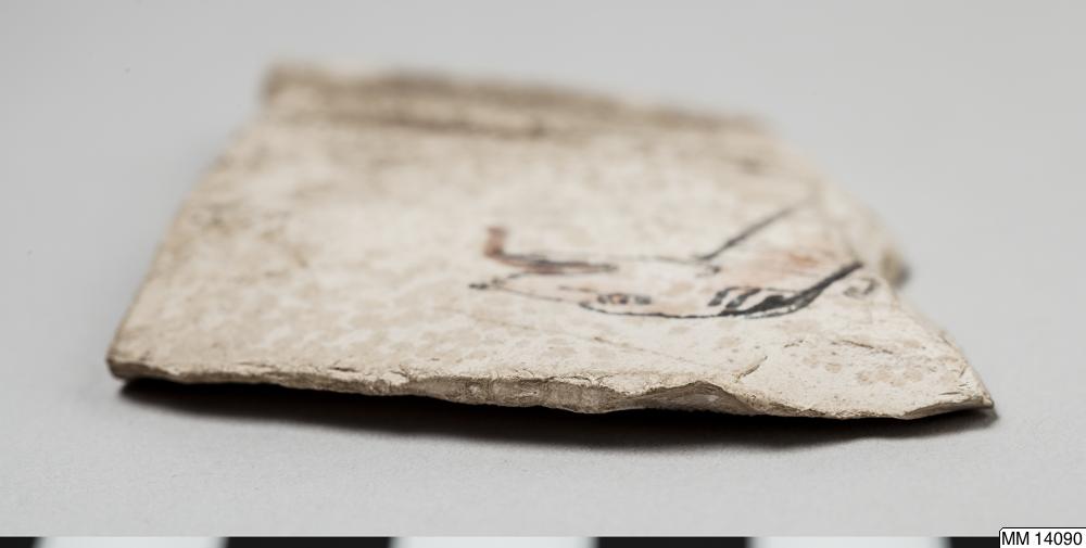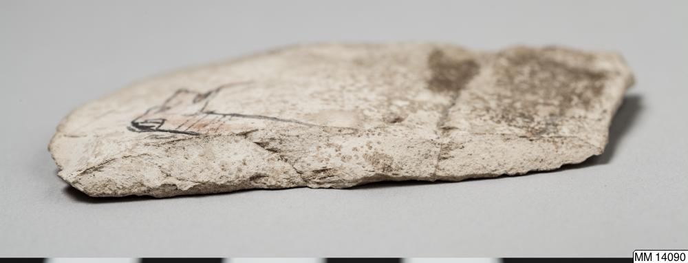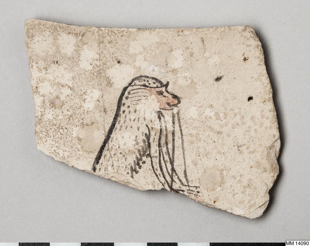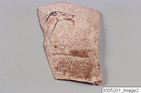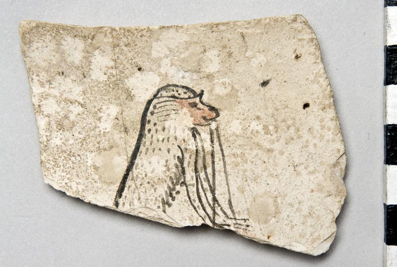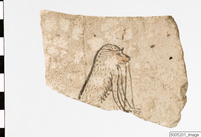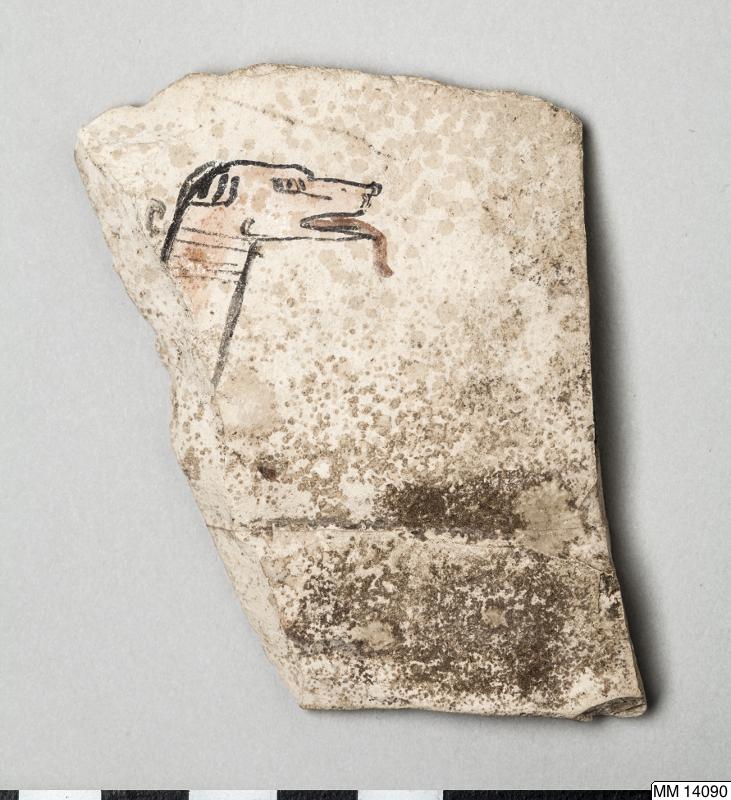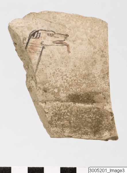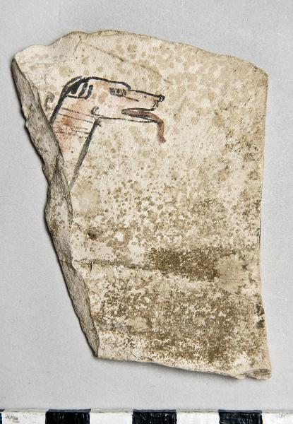 Ostracon, fragmentary sketches on both sides in black and red. On one side is the upper body of a monkey, facing right. It is playing a double flute, which is only marked by single lines. The face is painted red, the fur highlighted by small black dots. On the reverse side is the upper part of the neck, and the head of a dog, with its tongue hanging out of its mouth. A collar is faintly outlined around its neck. The dog is outlined in black and coloured red. Limestone.