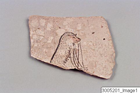 Ostracon, fragmentary sketches on both sides in black and red. On one side is the upper body of a monkey, facing right. It is playing a double flute, which is only marked by single lines. The face is painted red, the fur highlighted by small black dots. On the reverse side is the upper part of the neck, and the head of a dog, with its tongue hanging out of its mouth. A collar is faintly outlined a...