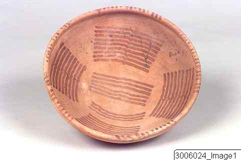 An open bowl with a flaring profile, tapering to a narrow flat base and a modelled rim. Buff surface with an exterior and interior decoration in maroon. The interior features six groups of ¨flying flamingos¨. On top of the rim are vertical lines. The exterior features, below and around the rim, five groups of multiple horizontal wavy lines.