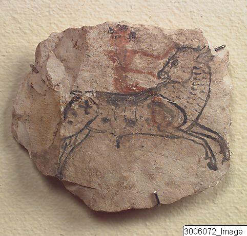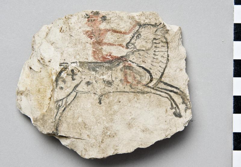Ostracon, irregularly shaped. Sketch on one side in red and black. It shows a running bull, heading towards the right while looking over its shoulder. It is outlined in black, with some larger spots, also in black. Sitting astride its back is a man, all red and seemingly naked. His head is shaved except for three ponytails. He wearing a black necklace. With his left hand he is holding on to one of the horns of the bull, the other hand is held against the face of the animal. Mounted with metal pins on fabric.