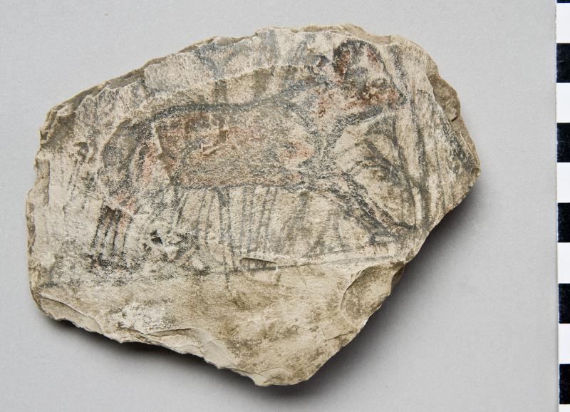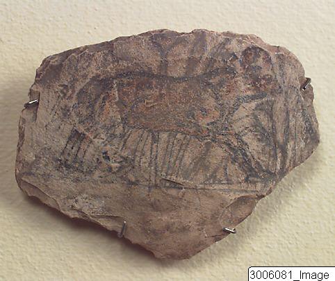 Ostracon, irregularly shaped. Sketch on one side in red and black. On a black baseline is a bull calf, running towards the right against a background of papyrus plants. Everything is outlined in black, the body of the animal is coloured red. Mounted with metal pins on fabric.