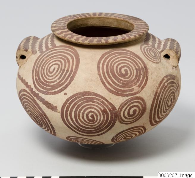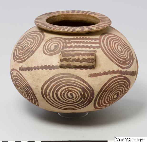 • A squat vessel with a modelled rim, round base and two tubular string-hole handles. Pale surface with an exterior decoration in maroon. It features multiple large and small spiral motifs as well as occasional and randomly placed vertical and horizontal wavy lines. In between the rim and the handles are multiple horizontal wavy lines which continue over the handles. The rim is adorned with vertical... Visa hela