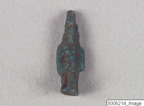 Amulet. Standing god, wearing a tall crown, lotus and feathers, or the double crown? Crude. Possibly Nefertem or Atum. Suspension hole through the crown.