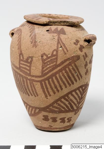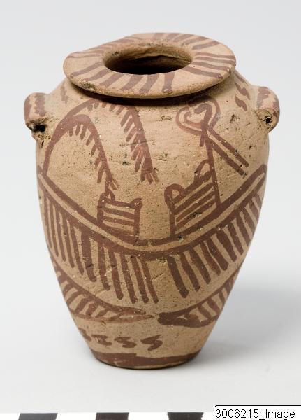 A vessel with an ovoid body, modelled rim, tapering to a flat base and two tubular string-hole handles. Buff surface with an exterior decoration in maroon. The rim features four bands of four, five, six respectively seven vertical lines. On top of each handle are three horizontal wavy lines. The two main surfaces feature a ship. Both are propelled by multiple oars, each have two cabins, a double branch at the prow and a standard, of which one has horns, the other one has three hills. Below and by the foot are three aloe plants, followed below by a few S-signs. The base has a lattice pattern, circumscribed by a line.