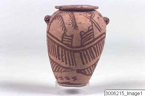 A vessel with an ovoid body, modelled rim, tapering to a flat base and two tubular string-hole handles. Buff surface with an exterior decoration in maroon. The rim features four bands of four, five, six respectively seven vertical lines. On top of each handle are three horizontal wavy lines. The two main surfaces feature a ship. Both are propelled by multiple oars, each have two cabins, a double b...