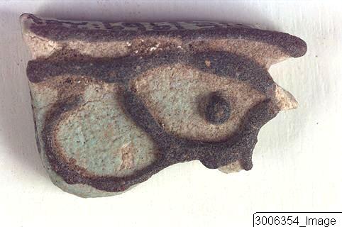 Wd3t-eye. Markings on both sides. One is green glazed the other is a green and black glazed composition. A threading-hole has been drilled through horizontally.