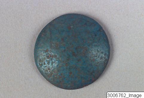 • Button-like, circular object. Convex, smooth upper surface. On the reverse, flat side is a threading hole.