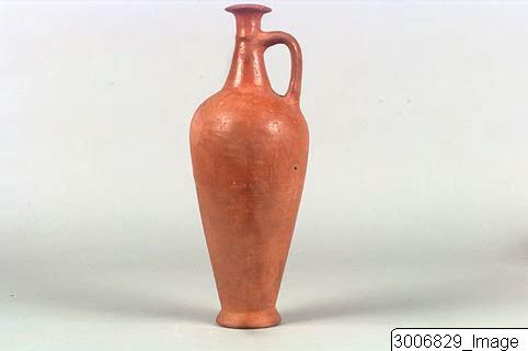 A red lustrous spindle bottle, with a tall narrow body tapering to a thick everted ring base, a trumpet shaped neck, and a circular mouth with a wide angular rim. An applied strap handle descends from the neck the shoulder. The vessel is wheel made and polished with vertical burnish strokes on the body and horizontally on the base, shoulder and neck. (Lacovara, P. Egypt´s golden Age: The Art of living in the New Kingdom 1550-1085 B.C., Museum of Fine Arts, Boston, 1982, p.85)