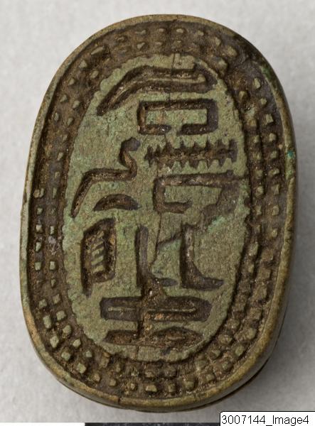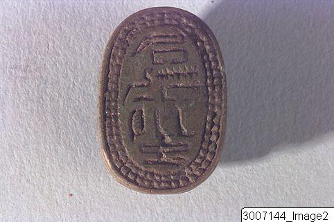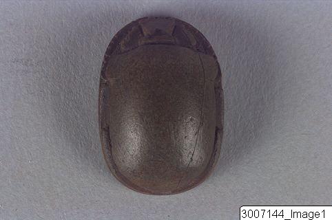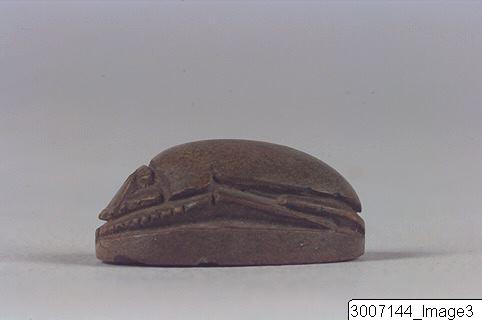 Scarab, well worked. Crinkly edged clypeus, head with eyes. Slightly curved prothorax. Legs clearly visible in profile, the front pair feathered. Threading hole running lengthwise through the piece. The underside has an hieroglyphic inscription.
