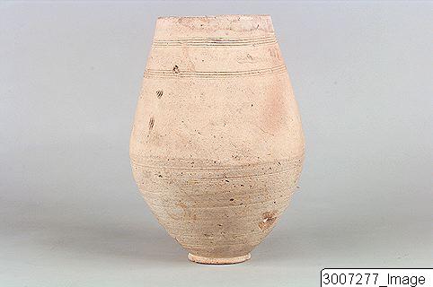 A tall, a bi-conical jar, with a direct rim and an applied ring base. Buff surface, smoothed. The top part of the vessel has two bands of horizontally incised lines. Rilling marks on the bottom of the jar.