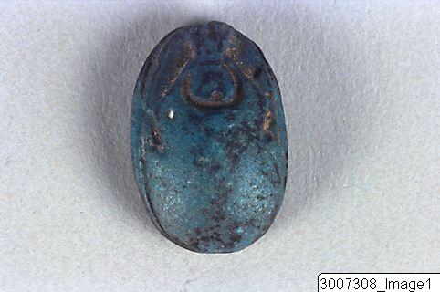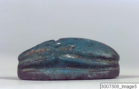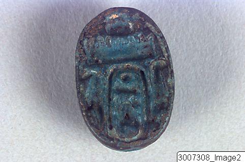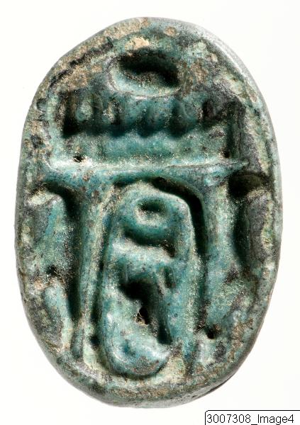 Scarab, head and clypeus in one piece, the head incorporated into the prothorax. The upper side has no details. 2 pairs of crudely worked legs visible in profile. Threading hole running lengthwise through the piece. The underside has within an oval frame a cartouch with containing the name of Thutmosis III: Mn-hpr-re, flanked by two Maat feathers. Greenish-blue faience.