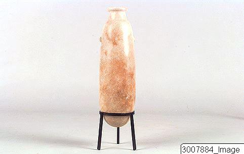 An alabastron, round bottom, tapering upper termination, short, tapering neck, square rim and two ¨nubbles¨on either side of the body.