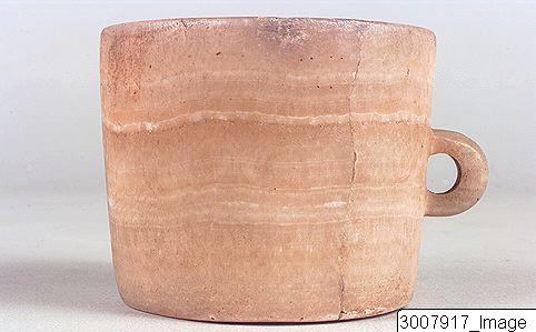 • A cup with a straight profile, flat base, direct rim and one tubular handle with a furrow on its outer perimeter.