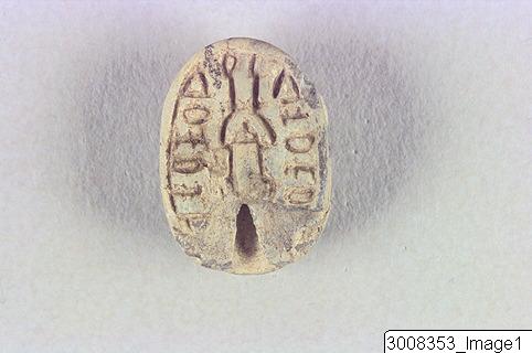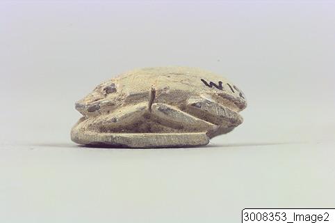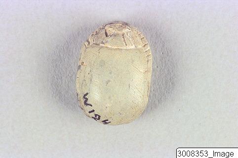 Scarab, head with eyes. Small incisions marking the prothorax. Three pairs of legs visible in profile. Incised hieroglyphs surrounding a scarab on the underside. Threading hole running lengthwise through the piece. Steatite, greyish white.