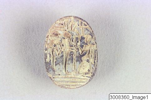 Scarab, upper side shaped as a human head, face and tall crown or wig. 3 pairs of legs visible in profile. Incised king, standing in front of Ptah and Sechmet. Above them an hieroglyphic inscription. Threading hole running lengthwise through the piece.