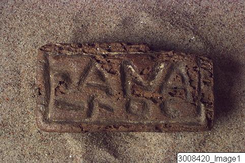 • Stamp seal, rectangular with raised handle, suspension hole. Incised Greek ? writing on the underside.