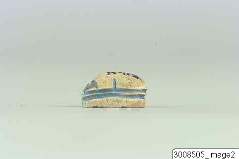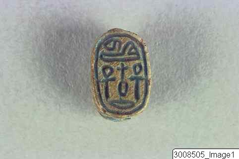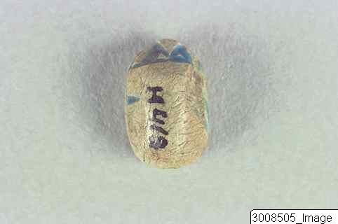 Scarab, short incised line marking the prothorax, otherwise undecorated upper side. Crudely worked legs visible in profile. Threading hole running lengthwise through the piece. Incised hieroglyphs on the underside. Ankh, nefer and more. Steatite, traces of green glaze.