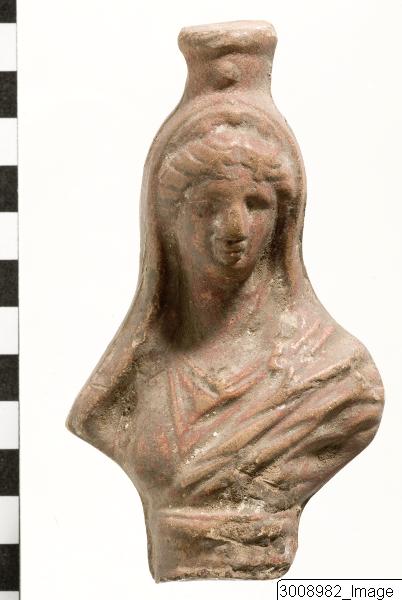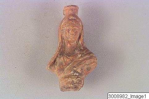 Figurine, bust of Isis or Demeter. Moulded. The goddess is wearing a polos and has her head covered by a veil which falls down over her shoulders. Her hair is wavy and combed towards the neck. Wide, flat nose, full lips. and is wearing a tall headdress.