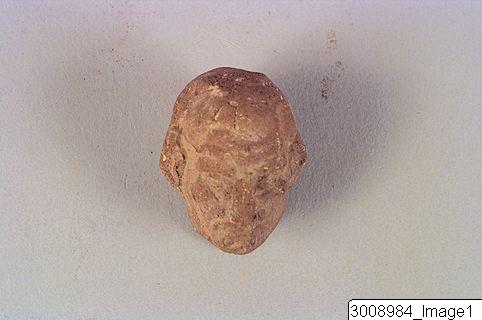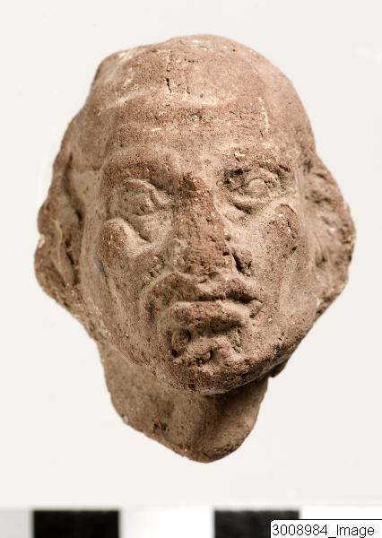 Head of figurine, male head. Moulded. Grotesque. Bald, wrinkled forehead, nose flattened. Wide mouth with thick lips. High cheekbones, ears not moulded. Neck filled with soft clay. Clay, brownish red.