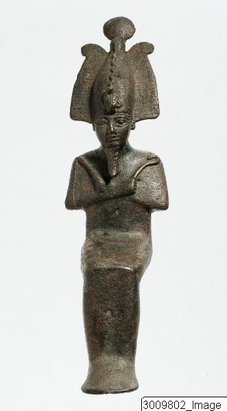 En statyett av en sittande Osiris. Han bär atefkronan med en solskiva och en uraeus. Hans skägg sitter ihop med bröstet via en kort brygga. Hans armar är lagda över bröstet. Högerhanden greppar krumst...