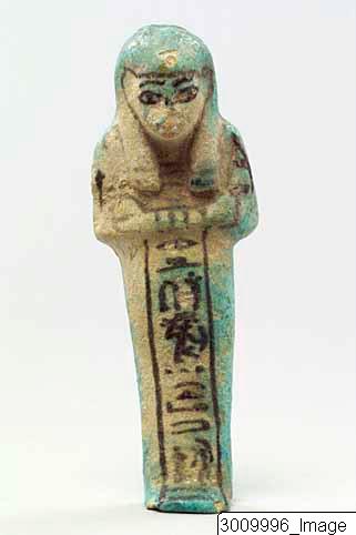 An inscribed ushebti with a single vertical column down in front. The glaze is bright blue-green, worn in front, preserved at back. Yoke and basket painted at the shoulders. The inscription reads ‹zir zS-mSa Xa-m-wAzt (Ranke PN I, 263:19), mAa-Xrw (Kha-em-waset was a a scribe of the army). Chipped at the foot and right shoulder.