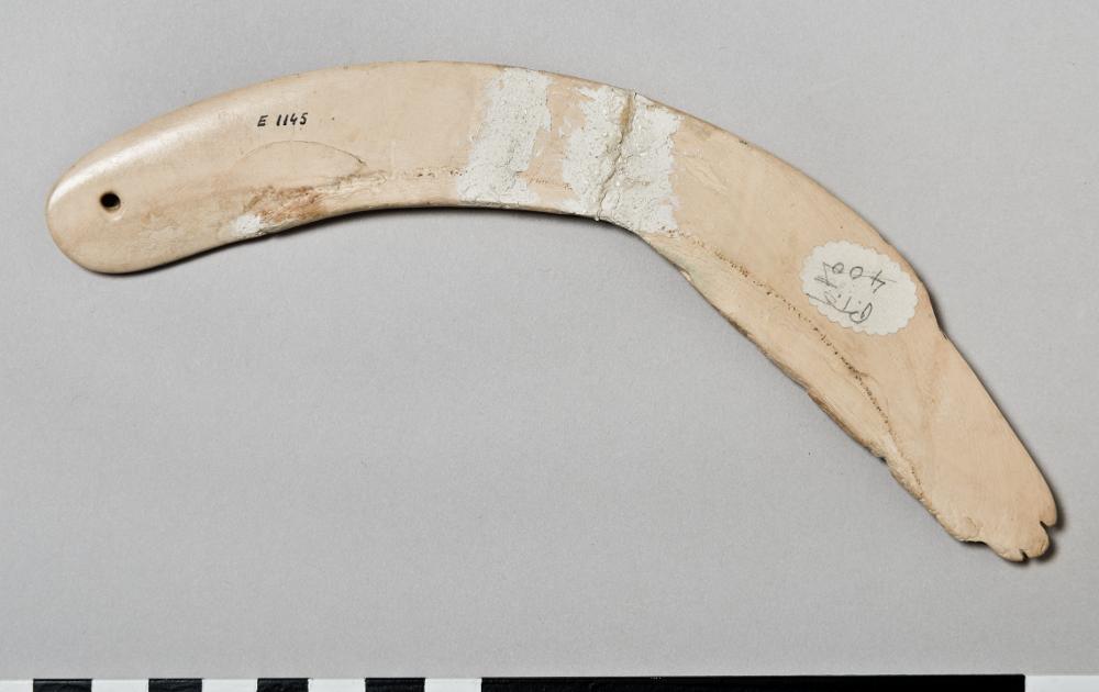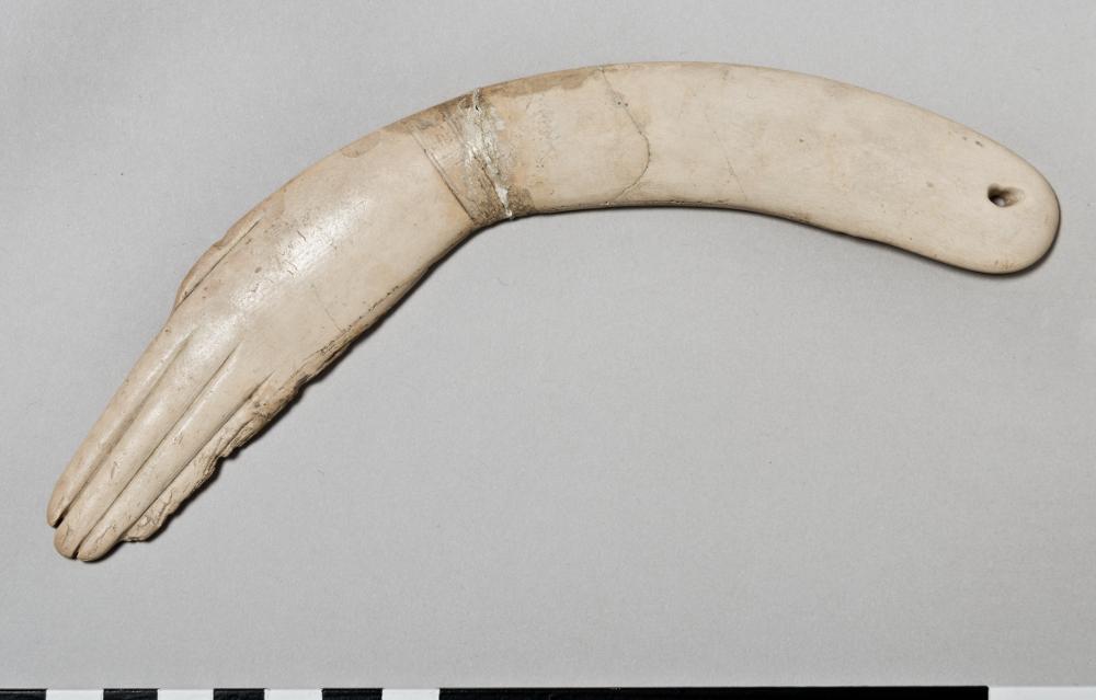 En halvmåneformad klappra som föreställer en vänsterarm och hand. Klappran är platt undertill och den övre ytan är något konkav. Bruten i två delar, reparerad. Lillfingret är flisat. Änden nära armbågen har ett genomborrat hål.