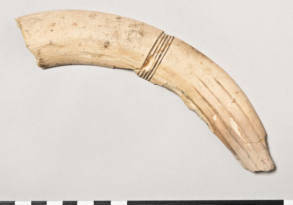En klappra som föreställer en högerhand. Fingrar indikerade med fyra inristningar. Handleden är prydd med ett armband, indikerat med fem inristade linjer. Klappran har blivit bruten och reparerad på f...