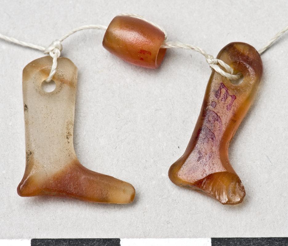 L.1.6 cm, W. 1.3 cm, T. 0.4 cm, L. 1.8 cm, W.0.9 cm, T. 0.3 cm (leg amulets), W. 0.3 cm, T. 0.5 cm (bead)