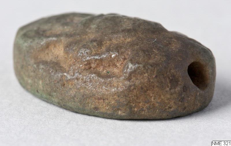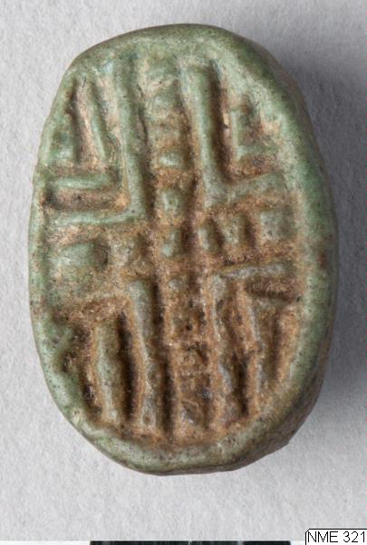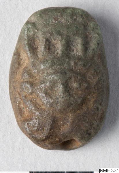 A seal with the obverse moulded into the head of Hathor, surmounted by a sistrum, shown en face. The reverse is decorated with a geometric design, consisting of a cross, lines and dots. Pierced lengthwise. Green glaze, now discoloured.