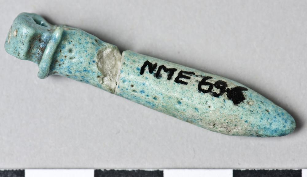 • A wadj pillar (papyrus column) in the round, no decoration. On top a suspension loop. Broken and repaired, chipped top rim. Bright blue glaze.