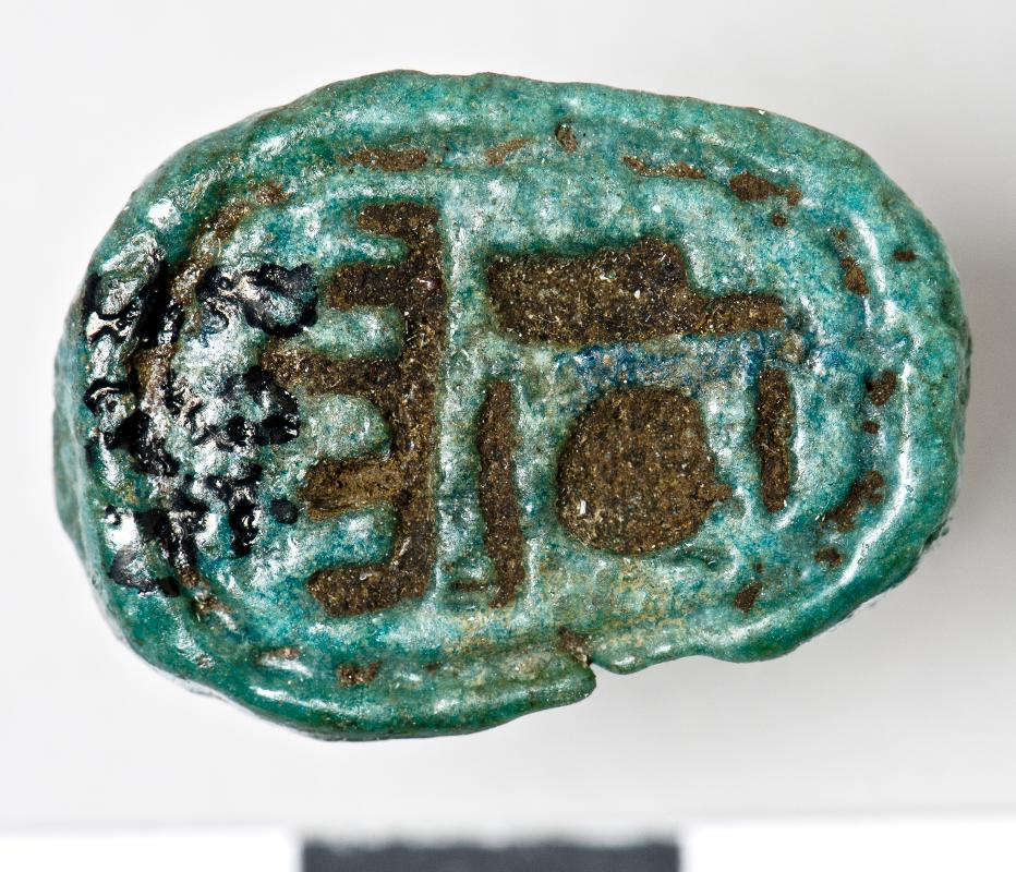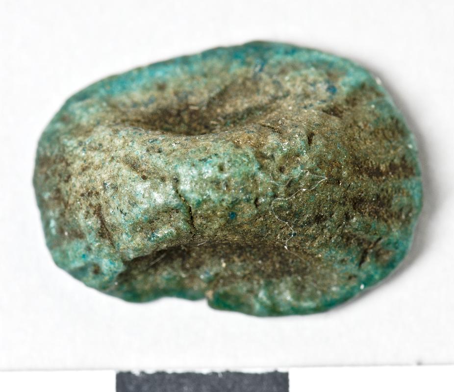 An oval seal amulet with the obverse in the shape of an open oyster shell. No suspension hole present. On the reverse there are hieroglyphs in sunk relief, which read Imn-Ra, encircled. Deep blue glaze.