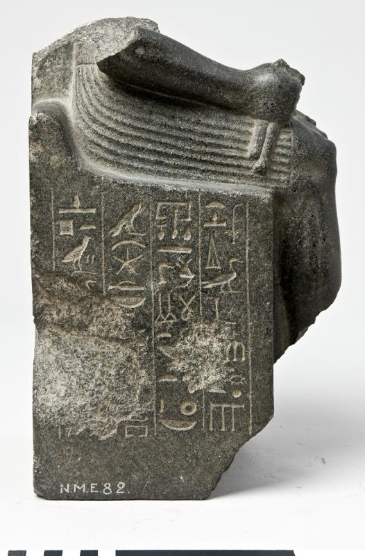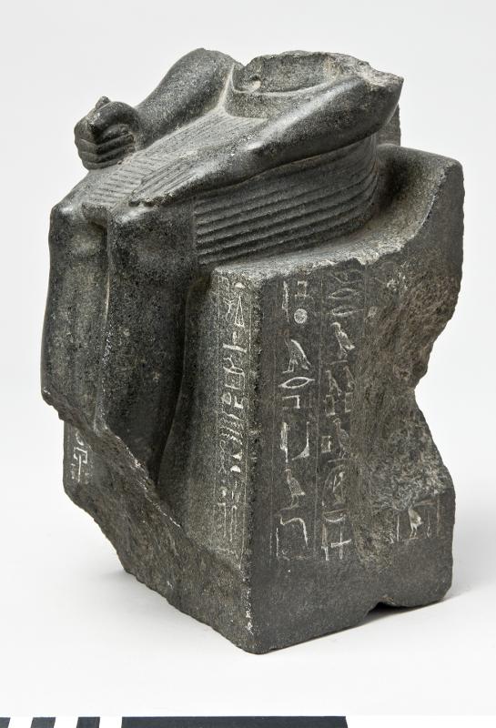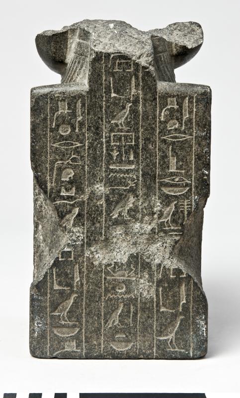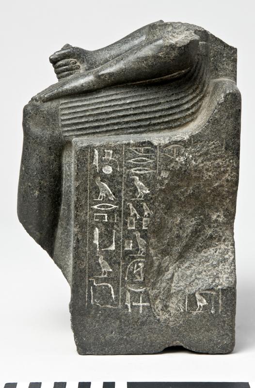 • Sculpture of a man sitting in a chair. Hieroglyphs around the chair. The owner is the house keeper Ibu. A house keeper named Hetepui is also mentioned.