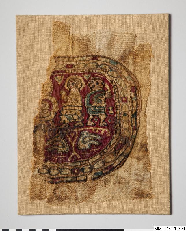 Fragment of decorative roundel (orbiculus), colours red, green, yellow, blue and black. Inside the roundel there are two human figures visible (possibly depicting Joseph with brothers), a third human figure is partially visible to the left, the centre figure is dressed in a long dress (probably a tunic) with yellow hair and a halo. The other human figure is on the right side facing away from the central figure, he is wearing a shorter dress (or tunic) and has black hair. The figures stand on a horizontal line, which also form the branches of a tree (possibly depicting the Tree of life). At each side of the trunk there is a bird with its head turned away and its claws stretched out from its formless appearance, the components create a symmetrical unit. The border is divided into three sections, the inner band is made up of different coloured section, the middle band is a repetitive flower petal pattern, the outer band has a pattern with ”gems”.