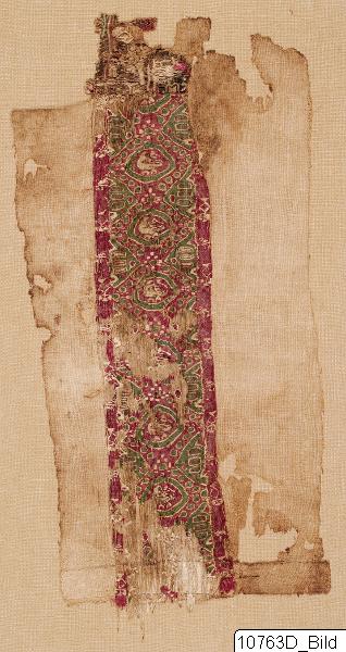 Fragment av dekorativt band, röd, grön och gulvit färg. Dekorationen består av ett band med ett geometriskt motiv med en romgallerdesign, repetitiva rombformer innehållandes en fågel och repetitiva triangelformer innehållandes ett geometriskt mönster. Bårder består av dekorativa form (möjligen föreställande stiliserade vas) och fåglar.