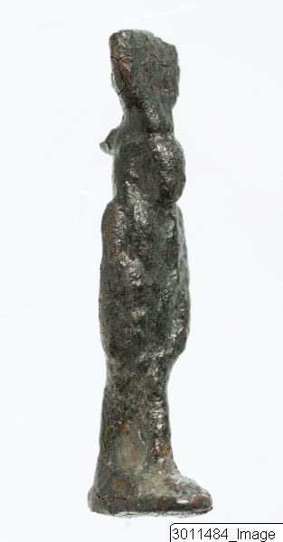 • A standing woman. Horned sundisc on the head. Hathor? Isis? Loop hole on the back of the head.
