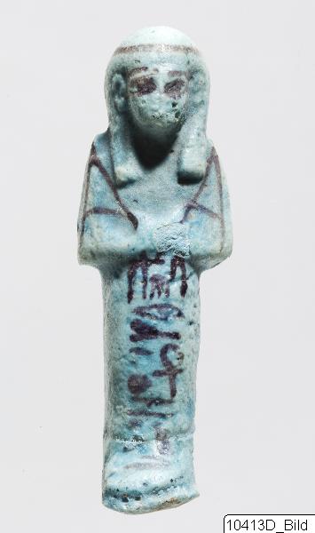 • Ushebti som står på en integrerad sockel. Inskriberad med en enkel vertikal kolumn i fram. Korg målad på ryggen. Blå glasyr. Inskription i svart bläck: shd wsir ankh = s-n-3st.