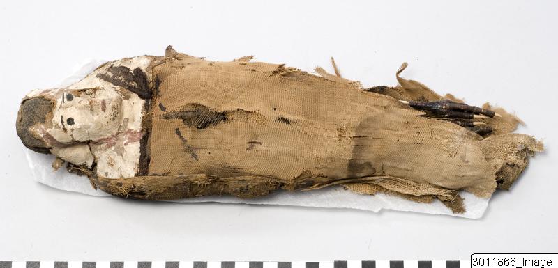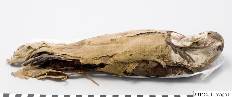 • Falcon mummy wrapped in linen. The head covered by a stucco mask in the shape of a human face.