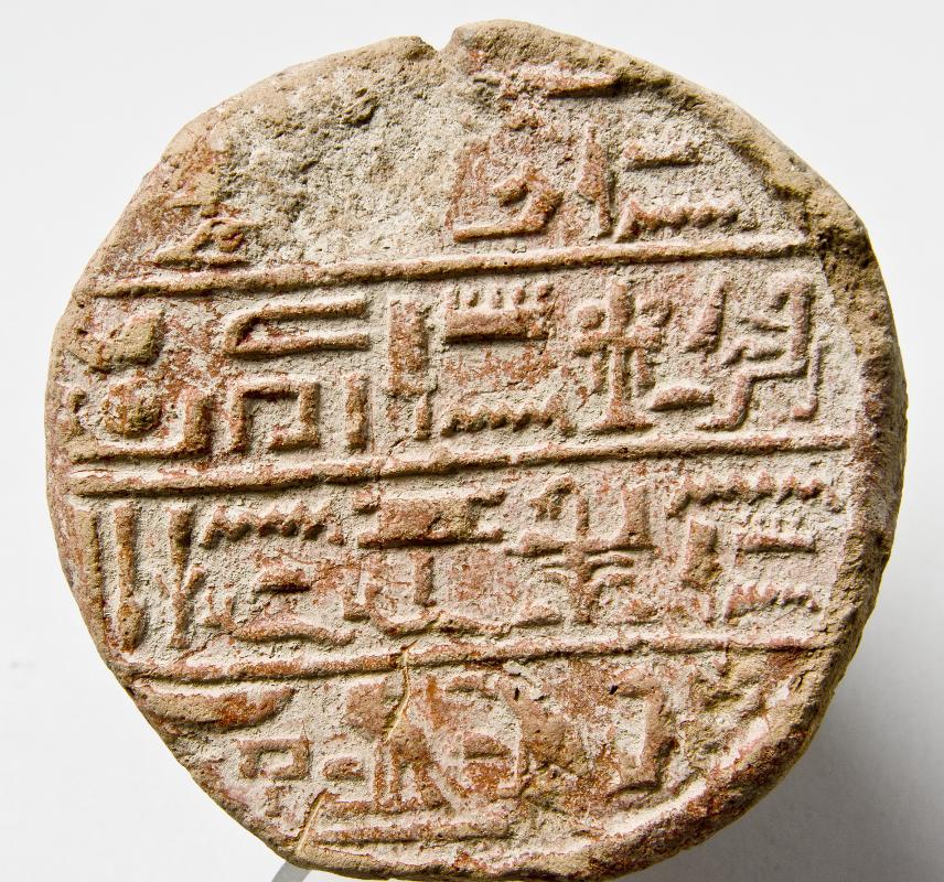 Cones of fired clay decorated the facades of graves, principally in Thebes, from the Middle Kingdom onwards. They varied in size and were with or without inscriptions. The inscriptions listed the tomb owner’s name and titles. A number of tomb cones bear traces of red colour. The function of the cones has been interpreted in various ways. Their form is reminiscent of Egyptian offering bread, but the round plate might also symbolise the sun. The cones might also imitate the roof beams that protruded from Egyptian house facades. The red colour was then to imitate wood. Over time the connection between funerary cones and roof beams was lost. The cones were primarily seen as decorative elements and as a way to highlight the deceased’s name.