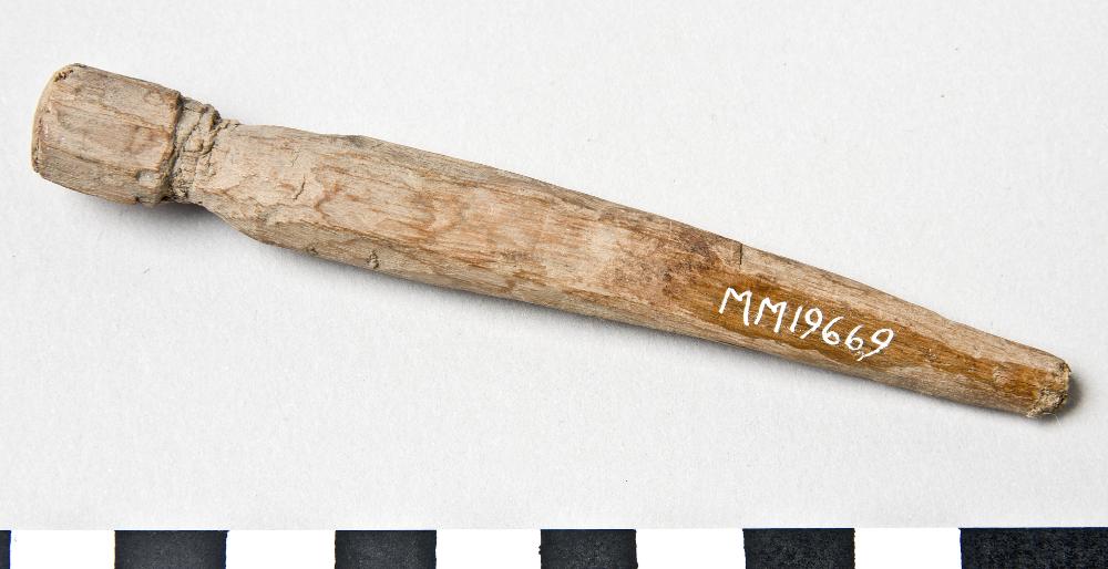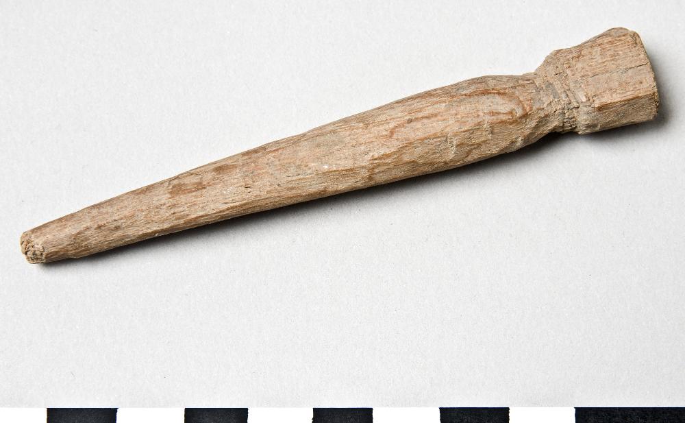 • A wooden peg. Pointed at one end, small head at the other. Traces of yarn wrapped around the peg.