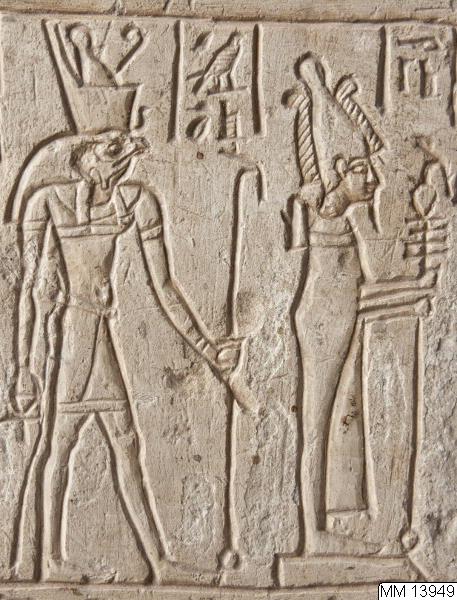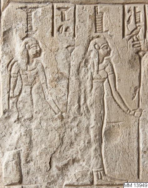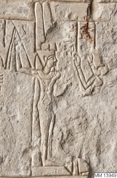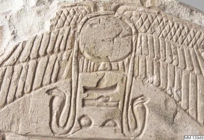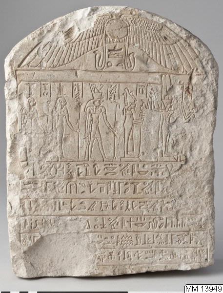 Stele with rounded upper part. Winged sundisc. A man worshipping Min, Osiris, Horus, Harsiese, Isis and Nephtys.Belonged to the priest Pa-scheri-amun.