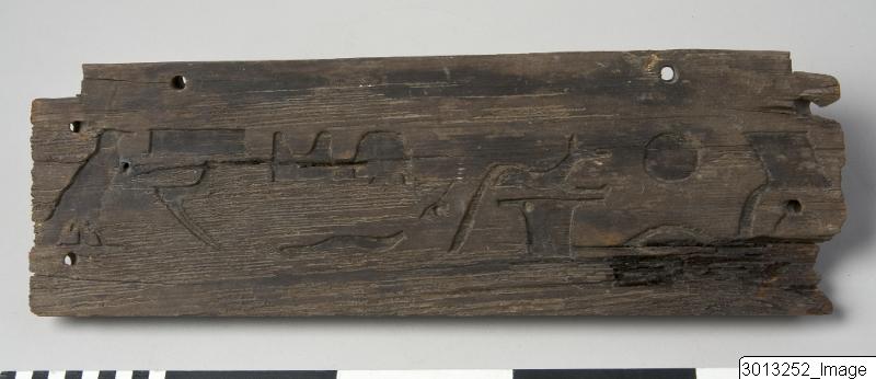 • Board from one short side of a sarcophagus. Incised hieroglyphs.