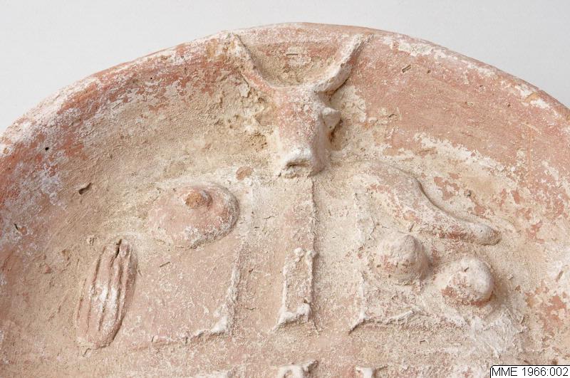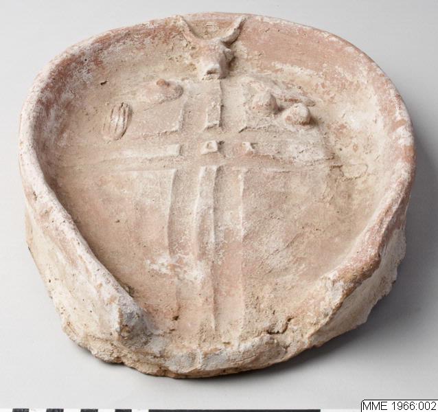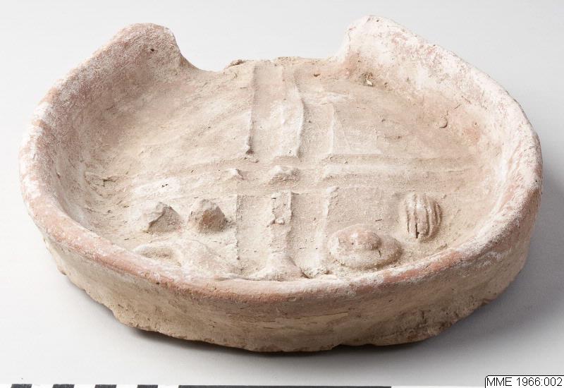 Enkelt offerbord i lera att lägga på eller vid graven. På bordet finns ett litet oxhuvud och rännor, som dryckesoffer var tänkt att hällas över.