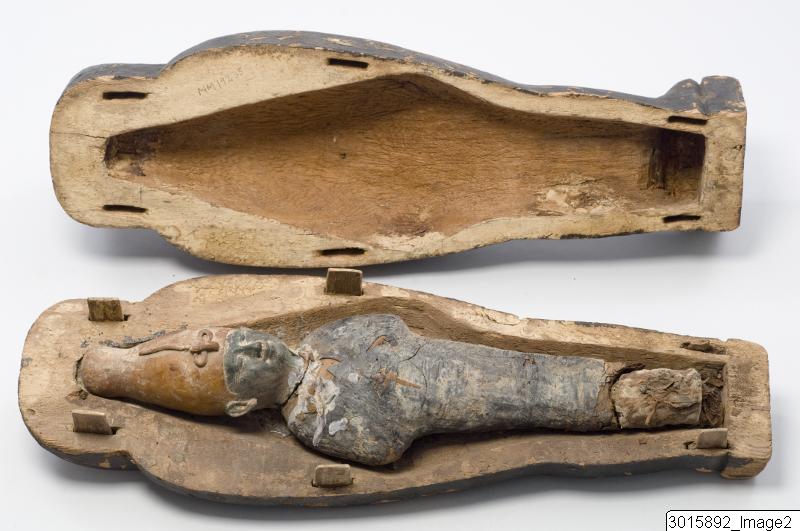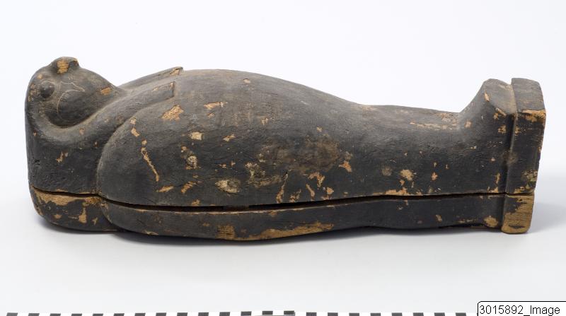 • Coffin in the shape of a falcon. The coffin contains an Osiris shaped pseudomummy. A so-called corn mummy.