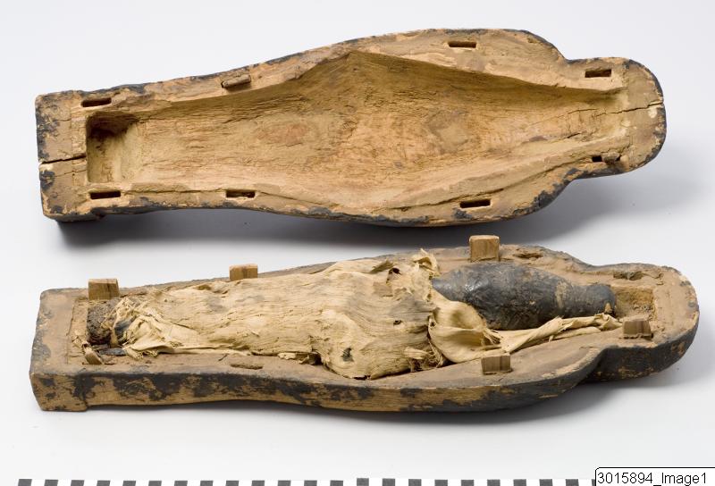 So-called corn mummies of clay, sand and seeds. The mummies were made to represent the god Osiris and referred to his ability of rebirth. Like the seed that sprouts from the clay, the deceased would be reborn to a new life on the other side of death. Corn mummies were placed in coffins with falcon heads that were associated with the tomb god Sokar. They were also used in connection with certain Osiris festivals.
