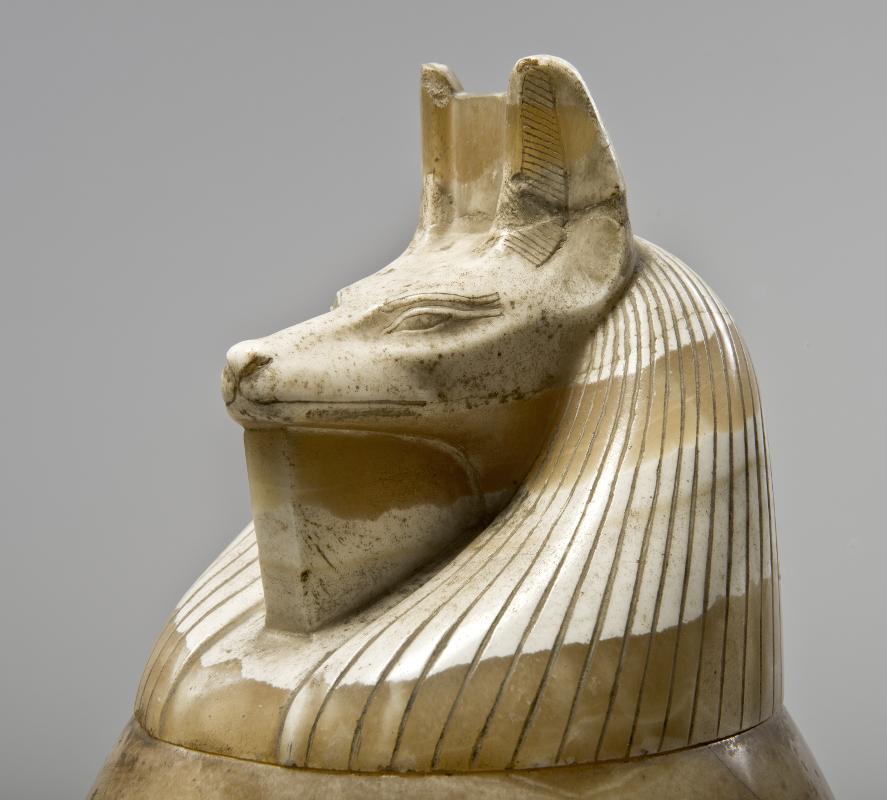 set of canopic jars belonging to the man Wahibremakhet. The lids are executed as the protector gods of the different organs; the jackal headed Duamutef, the baboon headed Hapi, the human headed Imsety...