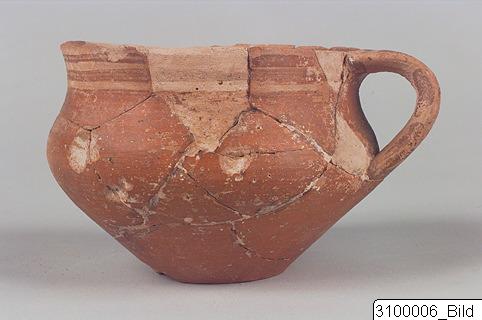 • High, slightly everted, almost vertical rim; biconical body; flat base; flat, vertical handle from rim to mid-body. Hard, buff clay; matt, buff slip; matt, reddish to greyish paint. Rim decorated with two bands; body completely coated; base reserved; handle decorated with coarsely painted horizontal, vertical, then horizontal stripes; interior painted.