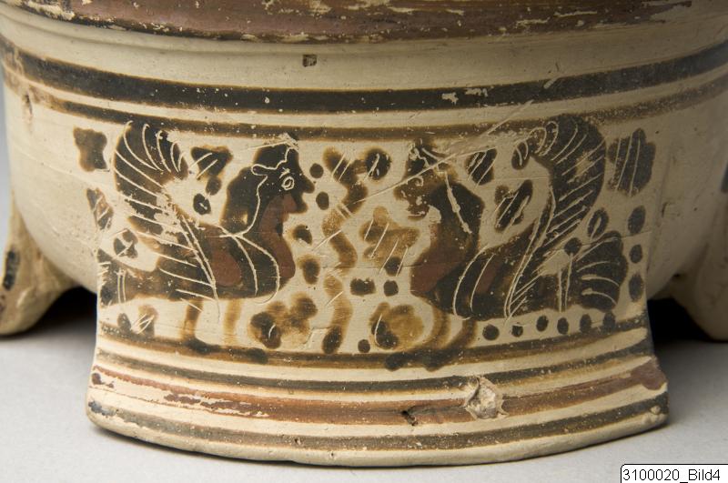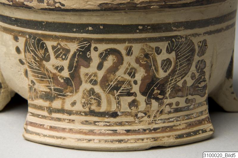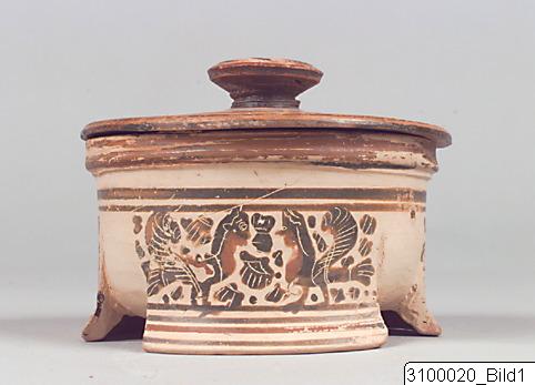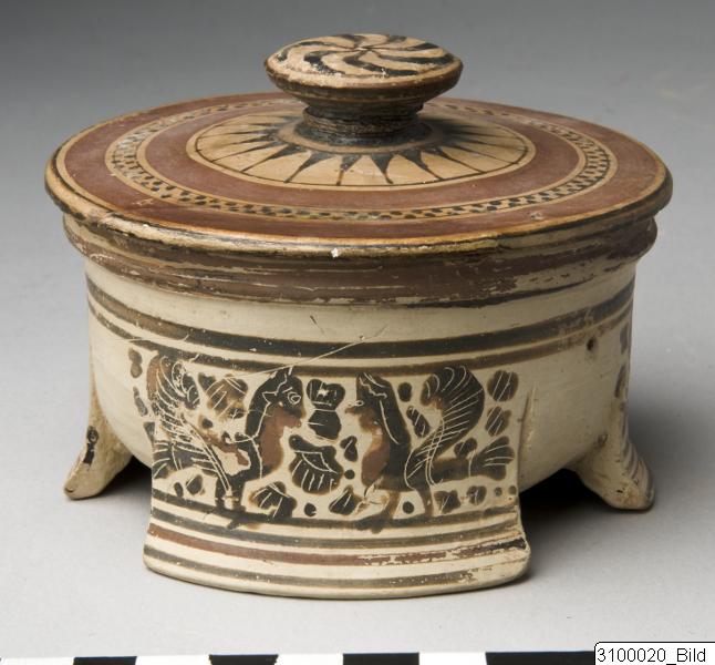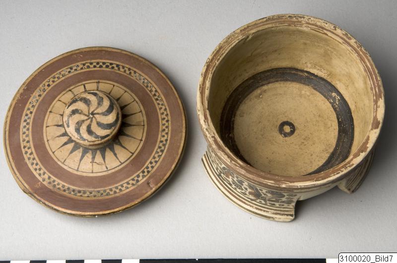 Tripod. Lid: almost flat, slightly convex with flat knob. Hard, buff clay; semilustrous, dark buff slip; semilustrous black and matt, pinkish paint. Knob top: inscribed whirligig; side and underside of knob painted; inscribed rays emanating from knob; two pinkish concentric bands, in between these, two rows of dots; painted edge; bottom reserved. Pyxis: straight, projecting rim; cylindrical body; rounded base on tripod. Hard, buff clay; matt, light buff slip; matt, black and reddish paint; incised decoration. On the inside, a small ring around the centre, broad band encircling floor; rim coated with reddish paint; upper body encircled by one broad and one thinner line; above each foot a decorated panel with two heraldically placed sirens with a swan/shell-like ornament/snake(?) between the sirens; filling ornaments: dots, blobby rosettes; three black and one reddish horizontal line on each foot.