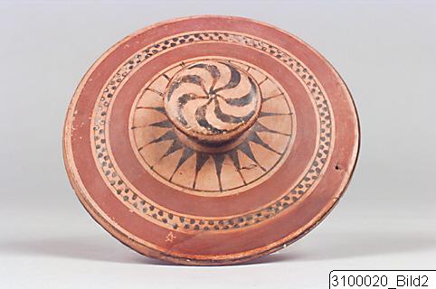 Tripod. Lid: almost flat, slightly convex with flat knob. Hard, buff clay; semilustrous, dark buff slip; semilustrous black and matt, pinkish paint. Knob top: inscribed whirligig; side and underside of knob painted; inscribed rays emanating from knob; two pinkish concentric bands, in between these, two rows of dots; painted edge; bottom reserved. Pyxis: straight, projecting rim; cylindrical body;...