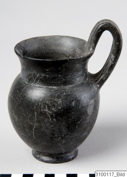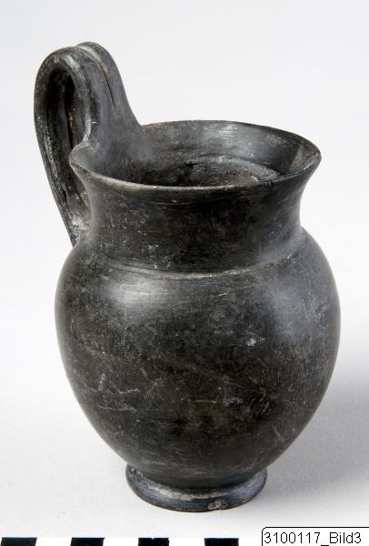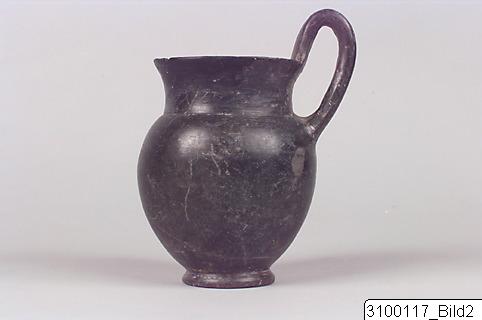 Wide, Everted rim; neck offset from body; almost ovoid body; double, rounded vertical handle from rim to upper body; torus base. Buccheroid impasto - greyish to brown surface, high sheen.