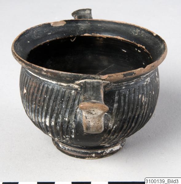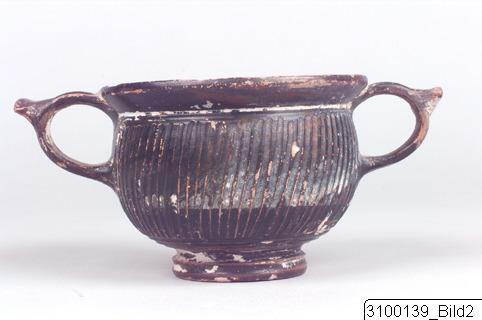 A skyphos (pl. skyphoi) is a deep-bowled drinking vessel with a low foot and two short handles that are usually horizontal. They were usually made of clay but could also be made of precious metals, such as silver or gold leaf, and cameo glass. They are regularly depicted in symposium scenes.